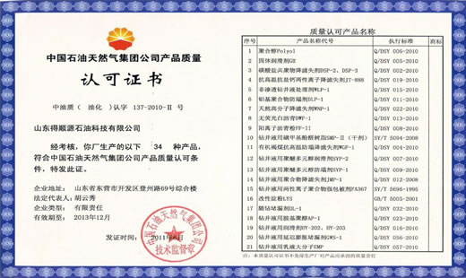 公司建立了先進(jìn)完善的內(nèi)控體系和質(zhì)量控制體系,通過了API spec Q1及API 13A認(rèn)證、ISO9001質(zhì)量管理體系認(rèn)證、14001環(huán)境體系認(rèn)證、18001職業(yè)安全健康體系認(rèn)證、HSE健康安全環(huán)保體系認(rèn)證和CNPC油田化學(xué)劑質(zhì)量認(rèn)證。